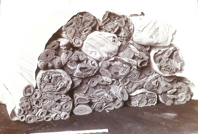 1. Bundles of scrolls from the cave, photographed by Stein. (c) British Library, Photo 392/27(589).