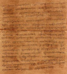 Let’s look at a manuscript that is widely assumed to have been written in the time of the Tibetan Empire. I think that it was perhaps not, and that giving it a later date might allow us to understand it better. Found on the scroll IOL Tib J 370, the text was first studied by Hugh Richardson, who translated its title as “The Dharma that Came Down from Heaven.” It tells of the activities of the great emperors Songtsen Gampo and Tri Song Detsen in bringing Buddhism to Tibet, and then goes on to lament a decline in Buddhism values in Tibet.